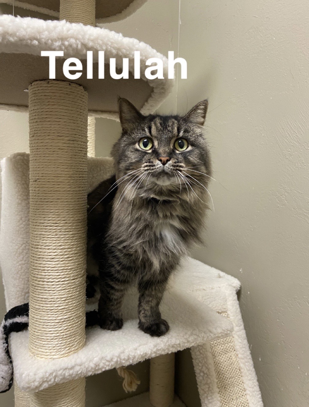 - Meet Cat and Tellulah! Cat and Tellulah are a bonded pair that were surrendered to the shelter after changes in their previous household. Cat and Tellulah are both UTD on all age-appropriate vaccines, spayed/neutered, FIV/FeLV tested negative and are microchipped. Due to past stress, Cat and Tellulah must be adopted into an adult only home, or a home with children at least 13 years old or older! Tellulah - Tellulah is a 5 year old, spayed female. She is the confident kitty in this duo, and she'll instantly want to be your best friend! She doesn't appear to have much of a playful side, but that could change in a home environment. Instead of playing, Tellulah likes to pass the time cuddled up with Scout on their cat tower. Cat - Cat is a 7 year old, neutered male. Cat can be a little nervous at first when he meets new people, but once he feels comfortable around you, he blossoms into a very loving boy! He doesn't appear to have much of a playful side, but that could change in a home environment. Instead of playing, you can find Cat cuddled up next to Tellulah.